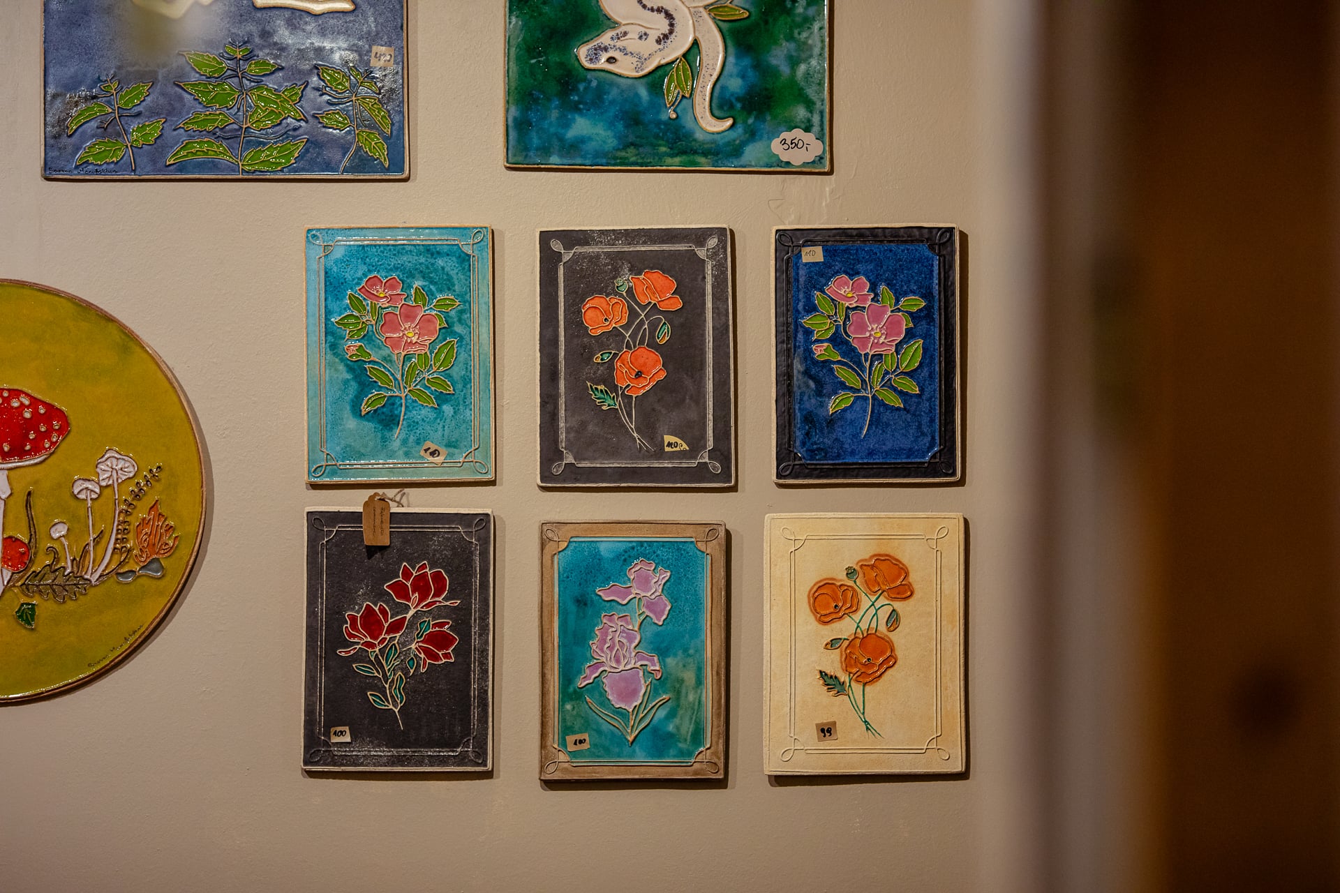 ✨ Ceramikę ręcznie szkliwiona z motywami przyrodniczymi – kolorowe kwiaty, ptaki i zwierzęta na drewnianych deskach i krążkach.